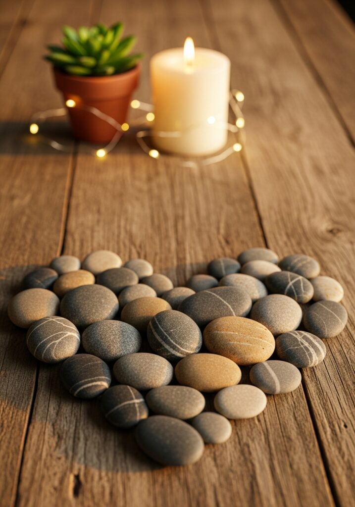 - Tiny twig hearts appear fast. Mason jars hold soft glows inside. Candles drift on still water surfaces. Stone shapes carved like love sit quietly.