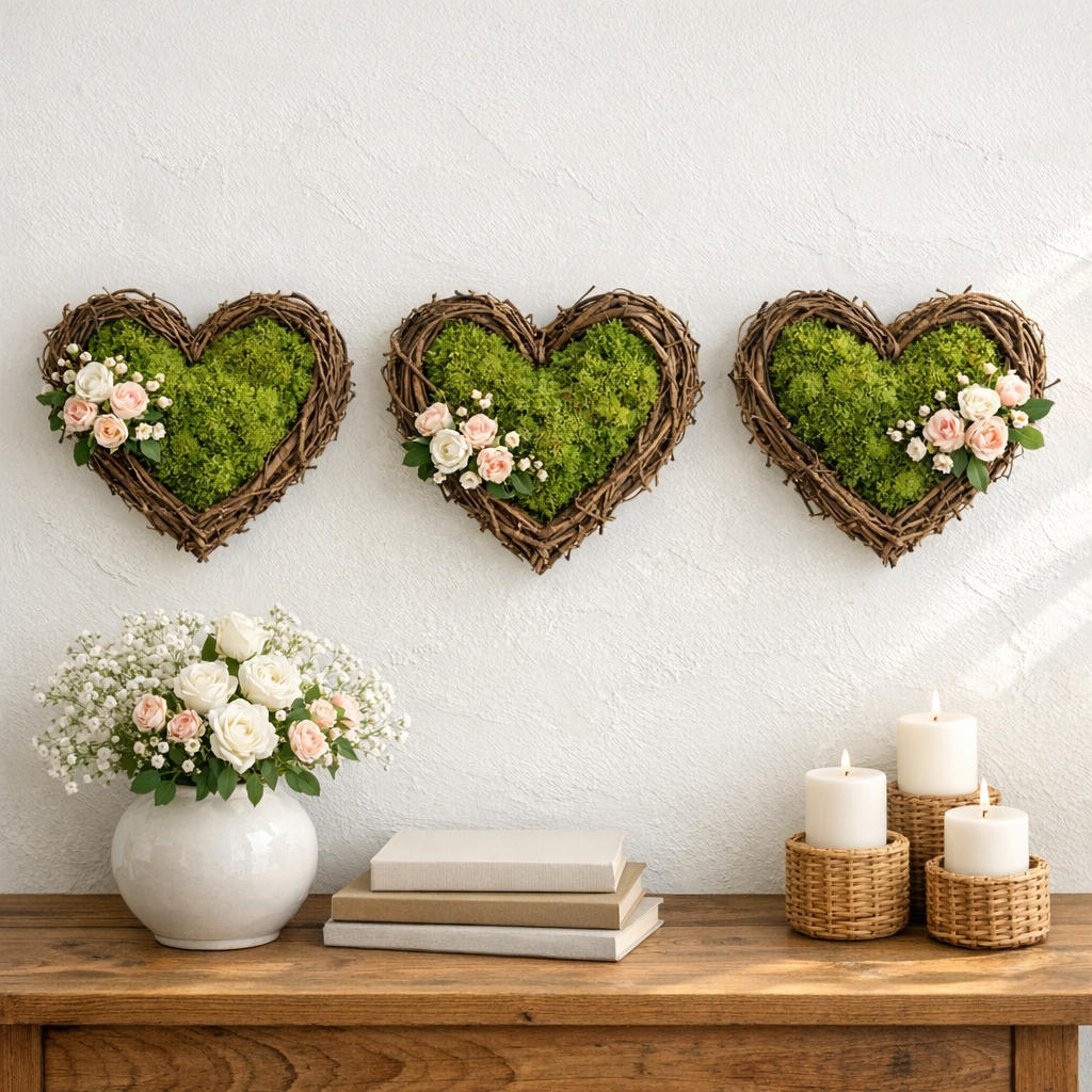Start by shaping a big heart out of cardboard. Cover every part with moss using glue. Twigs or tiny dried blooms can go on top here and there. Let it dry before lifting into place. Up it goes – find a spot where it catches the eye.