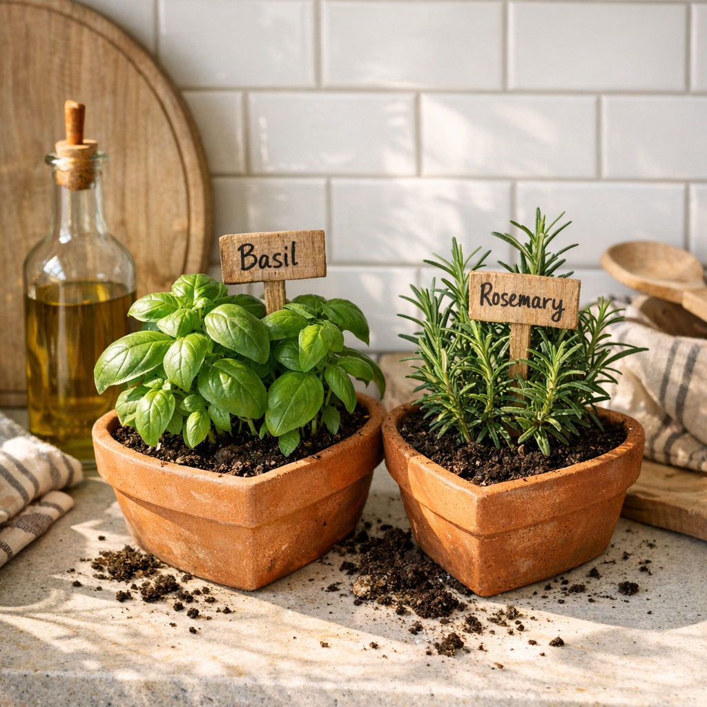 - Basil grows well near windows. Near basil, rosemary enjoys sunny spots too. Thyme spreads slowly through small pots